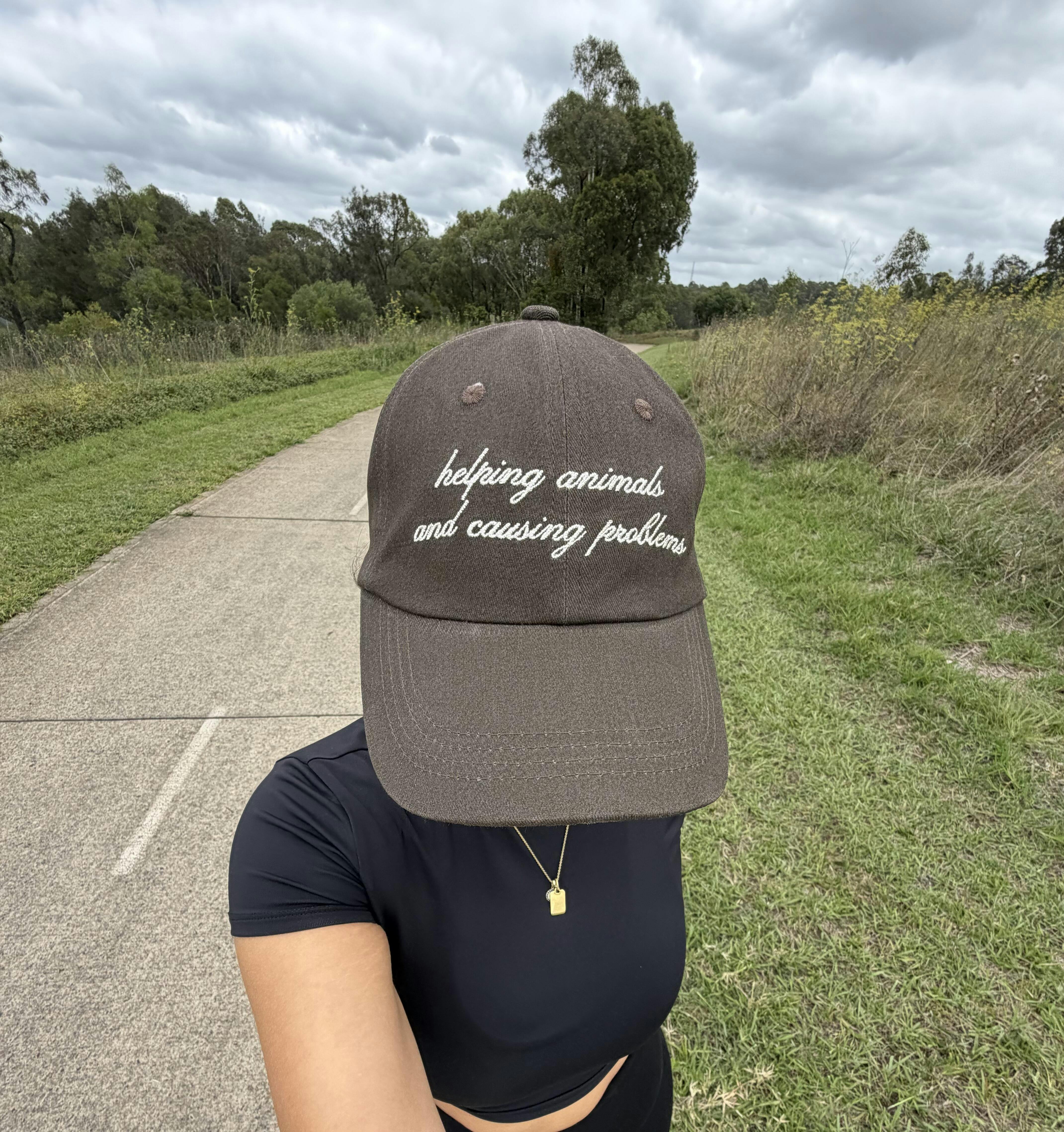 This chocolate brown dad hat is for the girls who care deeply and but aren't afraid to say it like it is! Featuring the bold front embroidery “helping animals and causing problems”, this hat is the perfect mix of sass, strong, and animal-lover energy.